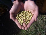 最高にいいお天気。延期が続いた大豆の収穫が、ようやくできました。刈り取って集めた大豆を、脱穀機にかけます。大豆トラストのみなさんの丹精込めた大豆です! |