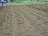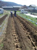 絶好のじゃがいも日和です。種芋と肥料を一歩ごとに溝に置いていきます。野菜の中でも、重要度の高いじゃがいも、元気に育ちますように! |